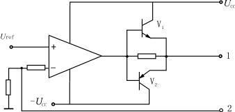 JTU—100型電子負載的原理圖如圖2所示,它最大可以吸收10A的電流,圖中V1、V2為調整管,Uref為可調基準源,1、2為輸出端,調節Uref的大小,不管負載如何變化,都可以在1、2端得到設定的電壓。