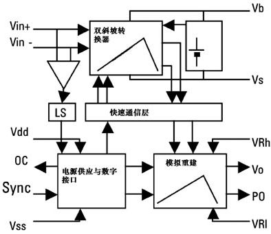 電機電流是通過使用一個外部分流晶體管來感測的,HVIC可將小的差分電壓(±250mV)通過一個精密電路轉換為時間間隔,這個精密電路的紋波去除功能有助于顯示小的群延遲。時間間隔是快速瞬變的,會被帶到輸出端。這樣就可以獲得與測量電流相對應的模擬輸出電壓,以便與外部參考電壓相比較,最大采樣率為40kSPS。對于頻率高達20kHz的非對稱PWM調制來講,這個采樣速率富富有余。20kHz時的最大延遲小于7.5s,對于被用來IGBT保護的電流感測信號來說也夠快了。圖4是電流感測電路。