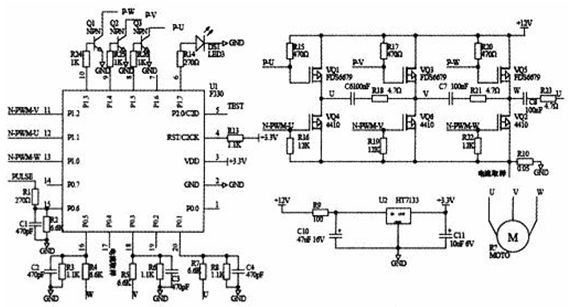 無位置傳感器控制系統以C8051F330單片機、逆變橋電路、端電壓檢測電路、穩壓電路等組成。逆變橋電路中上橋臂為P型MOSFET器件FDS6679,下橋臂為N型MOSFET器件M4410B,均為低電壓驅動器件。FDS6679通過一個NPN型三極管驅動,而M4410B由C8051F330的P1口直接驅動(P1口設置成推挽輸出)。PWM控制模式定為:PWM僅應用于半橋的下端MOSFET,同時換流的上端(對角線)MOSFET僅起換相通斷控制。