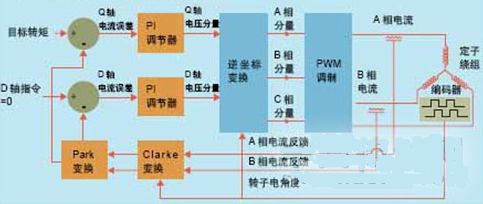 從控制原理上講,磁場定向控制方法的電流環運行是獨立于電機旋轉的。在FOC方法中存在兩個實際的電流環,一個用于Q軸轉矩,另一個用于D軸轉矩。Q軸轉矩電流環施以來自伺服控制器的用戶目標轉矩,D軸電流環則施以零輸進指令,以便使不想要的直軸分量降至最低。