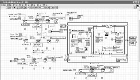 圖5是光伏發電數據監測系統前面板對應的部分程序框圖,主要包括電壓采集、電流采集、輻照度采集、溫度采集及其處理程序。