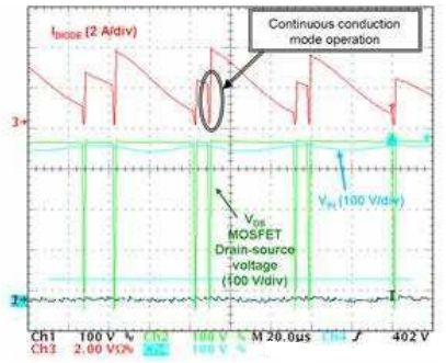 圖4顯示出現不穩定性問題時高輸入線路(正弦波頂端,此處Vin約為380V)下的VAUX電壓。我們可以看到MOSFET關閉時,VAUX電壓輕微躍升至高于ZCD閾值。由于其大紋波的緣故,在退磁相位期間,VAUX電壓首先增加,然后下降。由于在某些開關周期的末段VAUX接近ZCD閾值,這VAUX電壓下降導致零電壓比較器在電感磁芯完全復位前就翻轉(trip)。圖5證實了這一論斷。有時,升壓二極管仍在導電時,PFC段開始新的周期。這個現象主要導致線路電流失真(見紅色跡線)、功率因數退化,并可能有一些頻率處在人耳可聽到的噪聲。