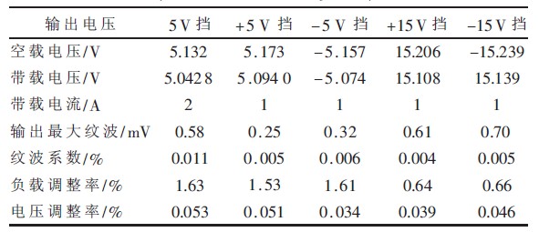 測試儀器采用固緯4 位半數字萬用表(GDM-8245) 、上海愛儀交流毫伏表(AS2294D) 和調壓變壓器(TDGC -0.5/0.5) .負載電阻采用水泥電阻(2.5Ω/20 W、5Ω/20 W、15Ω/20 W) .電源性能參數如表1 所示。可以看出, 負載調整率和電壓調整率反映出了電源較高的穩(wěn)定度, 紋波系數指標反映出低紋波特性。