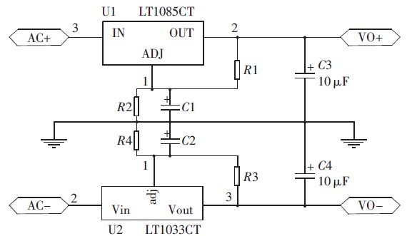 LT1083/LT1033 系列正負可調穩(wěn)壓器的效率大大高于現有器件,可以提供7.5 A、5 A 和3 A 輸出電流,并能在低至1 V 的壓差條件下運行,壓降在最大電流條件下保證在1.5 V 以內。負載電流減小時允許壓差同時減小,可在多種電流水平條件下通過片內修整電路,提供所保證的最小壓差,并能夠使輸出電壓準確度調節(jié)至1%.其電壓調整率為0.015%,負載調整率為0.01%,對電流限值也進行了修整,最大限度地減小了過載條件下穩(wěn)壓器和電源電路上承受的應力,具有熱功耗限制保護[10].LT1083/LT1033 系列器件的引腳與老式三端穩(wěn)壓器兼容,與大多數穩(wěn)壓器設計中的10 μF 輸出電容器以及PNP 穩(wěn)壓器多達10%的輸出電流作為靜態(tài)電流消耗不同,LT1083/LT1033 系列的靜態(tài)電流流入負載, 大大降低了電源功耗。此芯片電壓調整率小、負載調整率小的特點能夠保證輸出電壓穩(wěn)定度高。正負線性穩(wěn)壓模塊電路如圖3 所示,其中R1=R3,R2=R4.電路中的電阻參數可根據輸出可調電壓公式確定:
