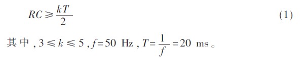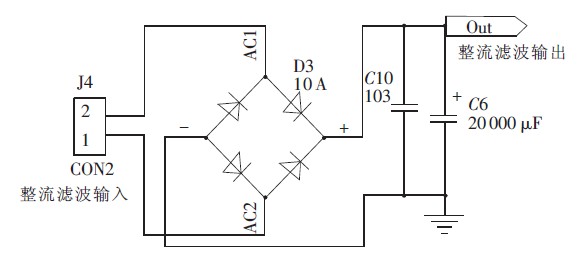 整流濾波電路主要由整流橋堆和大容量濾波電容組成, 如圖2 所示。整流橋堆具有體積小巧、輸出電流大、安裝方便等優(yōu)勢, 并能代替由4 只二極管組成的傳統(tǒng)橋式整流電路。濾波電路采用大容量電解電容濾波,增加了輸出電壓的穩(wěn)定性。根據式(1) 可求出所需濾波電容容量。