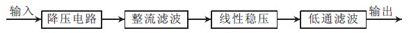 本設計由降壓模塊、整流濾波模塊、線性穩(wěn)壓模塊和低通濾波模塊組成, 如圖1 所示。變壓器將220 V/50 Hz 交流電分別降壓到±16 V、±6 V、+6 V, 通過整流橋堆整流以及大容量電容濾波后, 進入正( 負) 線性穩(wěn)壓模塊, 再經過低通濾波模塊濾除直流以外的干擾信號, 分別輸出±15 V、±5 V、+5 V 的穩(wěn)定電壓。