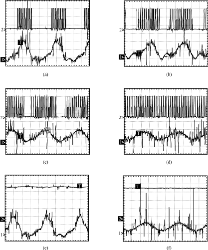 圖3(a)(b)(c)(d)示出了不同L、C參數(shù)時(shí)直流電源的控制脈沖和輸出電流。其中(a)為沒有LC濾波電路時(shí)的實(shí)驗(yàn)波形,(b)的濾波參數(shù)為L=2mH、C=1100μF,(c)的濾波參數(shù)為L=2mH、C=2200μF,(d)的波波參數(shù)為L=2mH、C=3300μF。由圖可見,當(dāng)逆變器輸入側(cè)不加LC濾波器時(shí),直流電源輸出電流大范圍波動(dòng),造成控制脈沖時(shí)有時(shí)無。其結(jié)果是系統(tǒng)噪聲變大,整機(jī)效率下降,可靠性降低。隨著LC濾波參數(shù)的加大,逆變器輸入電流的波動(dòng)逐漸減小,控制脈沖逐漸變得連續(xù),系統(tǒng)噪音變小,效率變高。為了保證逆變器輸入電壓的穩(wěn)定,濾波電感不宜加的太大,增大濾波參數(shù)適宜加大濾波電容。