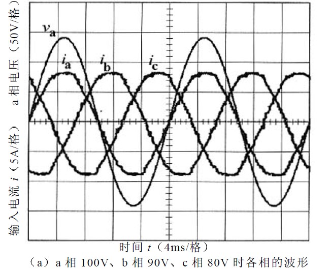 ③輸入缺相時,由于所缺相的電流必為0 ,由式(8 )和式(20 )可知,其他兩相的電流也必為0 .此時,整流器不能正常工作。