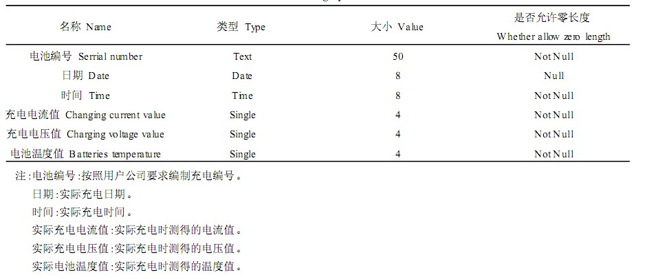 本系統(tǒng)設計了三個數(shù)據(jù)庫,用于標準充電曲線存儲、實際充電曲線存儲及分析結果存儲。使用VB6. 0提供的數(shù)據(jù)庫管理工具"可視化數(shù)據(jù)管理器"建立。其中實際充電曲線數(shù)據(jù)表如表1所示,數(shù)據(jù)庫的建立方便了對電池的查詢、分析,同時也方便了管理。