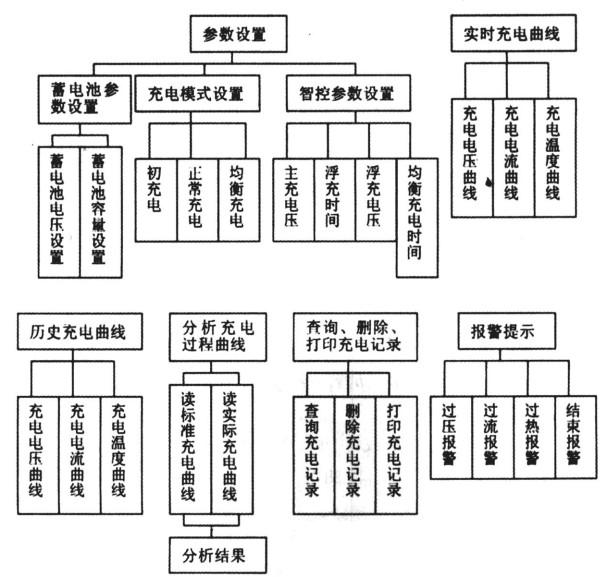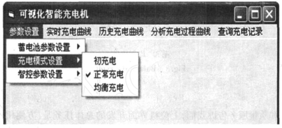 在參數(shù)設置中可以對框圖中所示的條目進行設置,使得該系統(tǒng)具有很強的通用性。電動車電池一般由幾個單體組合而成,可以選擇單體個數(shù)以確定電池組的電壓和容量。該系統(tǒng)提供了如框圖所示的三種充電模式,一般新電池前五次充電要進行初充電以充分激活電解質(zhì),當單體電量不同時要均衡充電,其余時正常充電。還可以按照需求設置不同充電階段的充電時間,來滿足各種電池的不同需求;實時充電曲線實時地顯示充電電流、電壓和電池溫度;歷史充電曲線可以顯示該電池組充電歷史;通過分析充電過程曲線即可了解電池存在的問題,如:蓄電池缺乏電解液、電解液比重不符合要求或蓄電池單體存在差異等,從而及時的對電池進行保養(yǎng);該系統(tǒng)還提供了按日期或電池編號查詢、刪除充電記錄的數(shù)據(jù)庫功能,方便了操作;報警提示用來告知用戶充電的過壓、過流、過熱情況以及充電是否結束。