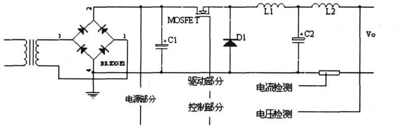 在主充電路中, 220 V電壓經(jīng)變壓器降壓后,由整流器整流和大電容C1 平滑濾波,作為直流充電電源。MOSFET、二極管D1、電感L1 和電容C2 構成主充電路。在工作過程中, PWM控制信號的高電平脈沖出現(xiàn),使MOSFET導通之后,電感L1 的電流不斷增大,電容C2 充電,主充變換器不斷存儲能量,同時通過電感L2 對電池充電,此時,續(xù)流二極管因反向偏置而截止。經(jīng)過PWM高電平脈沖持續(xù)時間后, PWM信號變低,MOSFET截止,電感L1 中的電流減小, L1 兩端的感應電動勢使續(xù)流二極管導通, L1 中的存儲電流和電容C2 存儲電荷向電池充電。經(jīng)過PWM信號的低電平持續(xù)時間后, PWM信號的又一高電平脈沖到來,再度使MOSFET導通,上述過程循環(huán)交替。電感L2 的作用是平滑充電電流.