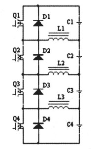 在均衡電路中,以4節(jié)電池為例,當對第二節(jié)電池均衡時,開啟MOS管Q2,蓄電池C2通過Q2給電感L1、L2充電,然后關斷MOS管Q2,則電感L1中的電流通過二極管D1回饋給蓄電池C1,電感L2中的電流通過二極管D3和D4回饋給蓄電池C3和C4,以達到各個單體均衡的效果。