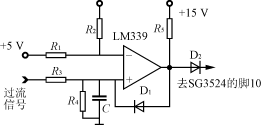 過流保護是利用SG3524的腳10加高電平封鎖脈沖輸出的功能。當腳10為高電平時,SG3524的腳11及腳14上輸出的脈寬調制脈沖就會立即消失而成為零。過流信號取自電流互感器(對SG3524-1芯片串接在工頻變壓器的副邊,對SG3524-2芯片串接在濾波電路前),經整流后得到電流信號加至如圖6所示過流保護電路上。過流信號加至電壓比較器LM339的同相端。當過流信號使同相端電平比反相端參考電平高時,比較器將輸出高電平,則二極管D2將從原來的反向偏置狀態轉變為正向導通,并把同相端電位提升為高電平,這一變化將使得電壓比較器一直穩定輸出高電平封鎖脈沖,則Boost電路停止工作,在正常狀態下,比較器輸出零電平,不影響Boost電路工作。