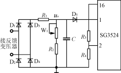 反饋調壓電路圖如圖7所示。當逆變器正常工作時,逆變器的輸出信號接反饋變壓器,其二次電壓經整流,濾波,分壓得到反饋電壓uo,顯然,uo的大小正比于逆變器的輸出電壓。調節W1可調節負反饋電壓的大小,從而調節逆變器輸出電壓的幅值。uo控制信號被送到SG3524-1芯片的誤差放大器的反相端腳1。誤差放大器的同相端腳2接參考電平。這樣,SG3524的輸出脈沖的占空比就受到反饋信號的控制。調節過程是這樣的,當逆變器輸出因突加負載而降低時,它會使加在SG3524-1的腳1的輸入反饋電壓下降,這會導致SG3524-1輸出脈沖占空比增加,從而使得Boost電路輸出電壓升高,逆變橋的直流電壓升高,逆變器輸出交流電壓升高。反之亦然??梢?,正是通過SG3524-1的脈寬調制組件的控制作用,實現了整個逆變器的輸出自動穩壓調節功能。