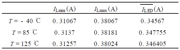 在V in = 12V 時(shí),對LED 驅(qū)動(dòng)電流進(jìn)行溫度特性仿真,三次仿真波形結(jié)果分別如表2 所示。 可以看出,芯片的溫度特性較好。