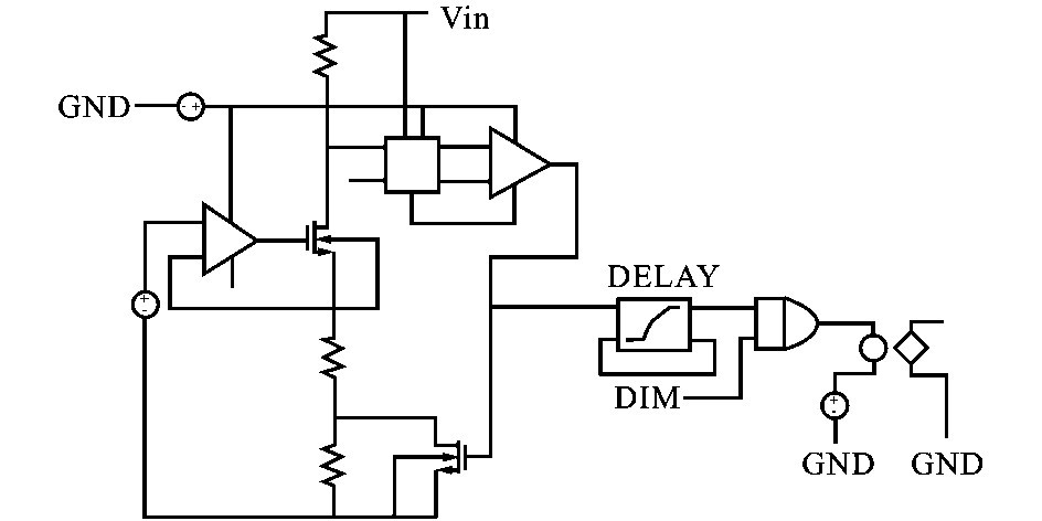 滯流控制模塊應(yīng)用如圖1 所示,L ED 驅(qū)動(dòng)電流的變化反應(yīng)在檢測電阻RSENSE兩端的壓差變化上。 本設(shè)計(jì)中,檢測電阻設(shè)為0. 5Ω ,較小的檢測電阻有利于降低功耗和保持較高的轉(zhuǎn)換效率。 滯環(huán)電流控制模塊內(nèi)部自建兩個(gè)電壓閾值,檢測電壓Vcs與閾值電壓進(jìn)行比較,比較結(jié)果和DIM 調(diào)光信號(hào)相與來控制功率開關(guān)管的通斷。