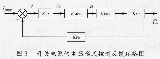 KFB=UREF/Uo,為反饋系數;誤差e為輸出采樣值偏離穩態點的波動值,經電壓誤差放大器KEA放大后,得;KMOD為脈沖寬度調制器增益,KMOD=d/=1/Vs;KPWR為主電路增益,KPWR=/d=Uin;KLC為輸出濾波器傳遞函數,KLC=(1 sCRe)/[S2LC s(ReC L/Ro) 1]。