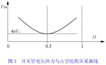 上式說明,當變壓器匝比愈小時,對于一定的輸入電壓和輸出電壓的變換器,開關管電壓應力vds愈小。所以,有源鉗位正激變換器一個顯著優點是可以降低開關管電壓應力,從而可選用額定電壓較低、通態電阻較小的功率開關管。另外,當變壓器變比n確定后,開關管電壓應力僅與占空比有關,如圖3所示。顯然,當占空比為0.5時,開關管承受最小的電壓應力。當輸入電壓變化時,如果將占空比設計運行在以0.5為中心的對稱范圍內,則可使開關管承受的電壓應力基本保持恒定。