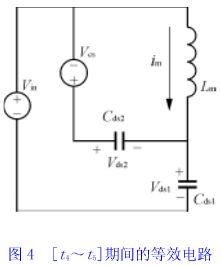 [t4~t5]期間電容cds1、cds2與lm發生諧振,并在t5時刻電壓vds1下降到vin,變壓器磁芯完成磁恢復。