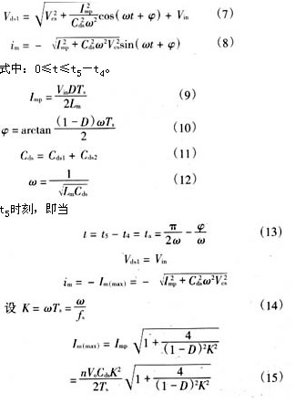 從上面的分析可明顯地看出,當變壓器勵磁電感lm減小,勵磁電流足夠大時,[t5~t0′]期間勵磁電流除了能提供負載電流外,剩余部分可用來幫助電容cds2、cds1充放電。電壓vds1有可能諧振到零,從而實現主功率開關管s的零電壓軟開通。二極管d1可為負的勵磁電流續流。關鍵工作波形如圖2(b)所示,具體的軟開關條件將在下一節中詳細討論。很顯然,軟開關的代價是變壓器勵磁電流和開關管導通電流峰值大幅增加,開關管及變壓器電流應力和通態損耗明顯加大。
