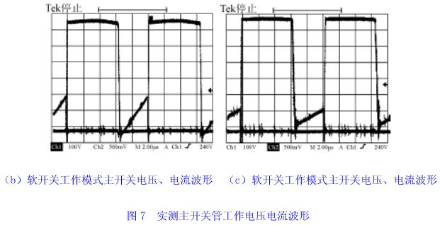 圖7(a)、7(b)、7(c)給出了實測的主開關管工作電壓、電流波形。圖7(a)顯示主開關管工作在硬開關狀態。圖7(b)和圖7(c)分別是采用增加勵磁電流方法和應用磁飽和電感器方法實現零電壓軟開關的電壓電流波形,后者明顯地降低了勵磁電流和開關管電流的峰值。實測波形與理論分析完全一致。圖8、9顯示出了實測的效率曲線。從圖9中看出,當變換器開關頻率增加時,變壓器勵磁電流損耗和開關管通態損耗所占比重增加,變換器效率降低了。實驗結果驗證了理論分析。