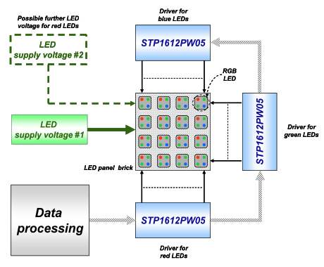 圖 3:通過(guò)STP1612PW05驅(qū)動(dòng)一個(gè)全彩LED顯示屏點(diǎn)陣的設(shè)計(jì)簡(jiǎn)圖