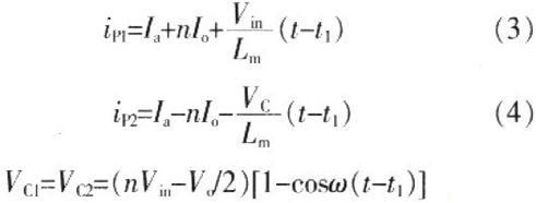 兩端電壓從零開始諧振增大,在半個諧振周期后達到最大值VC1max=VC2max=2nVin-Vo,此時模態2結束。模態2中,VD5=VD6=0,VD7=Vo。二極管D2、D3兩端反向電壓從V0逐漸增大VD2=VD3=4nVin-V0。