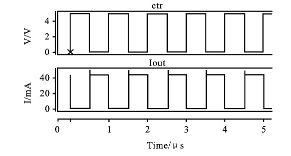 控制ctr信號變化時驅(qū)動電流變化情況如圖3.結(jié)果顯示ctr對驅(qū)動電流具有輸出使能控制作用,測量得到控制信號ctr響應(yīng)時間僅為7ns.