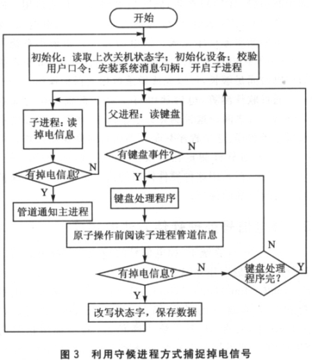 另一種方式是采用守候進程的方式,開通一個進程,此進程專門等待中斷信號。主程序根據數據操作對象的不同,將自己的流程方案劃分成若干原子操作,所謂原子操作即劃定的程序塊要么完全執行,要么不執行。每個操作對應惟一狀態標志。在每個原子操作前,主進程都將會通過管道通信的方式閱讀中斷信號。如果中斷信號產生,主進程首先保存狀態標志,然后將相關數據寫往Flash后退出,電源恢復后,主進程首先根據標志字確定系統恢復方案。圖3用流程圖的方式實現這一過程。