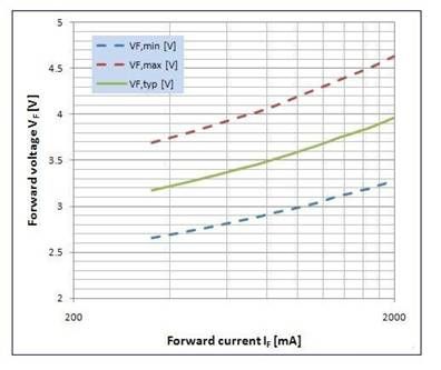 移動電話中閃光燈 LED 的高正向電壓和電流以及給定的電池電壓,讓升壓轉換器成為最佳的解決方案。驅動大電流時,基于電感的升壓轉換器呈現出令人滿意的效率。LED必須為電流驅動,因為正向電壓不僅僅隨溫度而變化,而且也有其自身的差異。正向電壓的這種變化源自于其生產過程,其變化范圍為 ±20%,請參見圖 1。