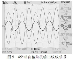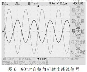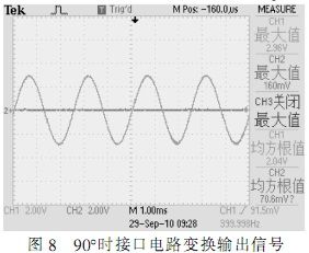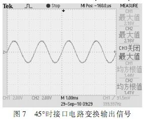 根據圖中所示,在確定的角度下,自整角機三路線線信號在電壓上呈120°正弦關系,接口電路轉換輸出信號為兩路電壓正交信號,根據角度不同,兩路信號電壓峰值不同,單路最大時電壓為2Vrms。測試結果完全符合設計要求。