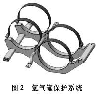 ( 2) 氫氣罐保護。高壓氫氣罐的固定支架和鋼帶應有足夠的強度,以保證在碰撞過程中,高壓氫氣罐的動態位移不會太大,避免造成連接管路的斷裂、變形和氫氣的大量泄漏。何健[13]基于顯式有限元理論,按照 CMVDR294 法規對國內自主開發的某燃料電池轎車進行正面碰撞分析,對比分析兩種氫氣罐保護系統設計方案的計算結果,提出了安全有效的氫氣罐保護方案,即氫氣罐保護系統采用整體式設計。如圖 2 所示,氫氣罐框架通過 3 根橫梁和 2 根縱梁將兩個氫氣罐集成到一個框架總成。縱梁截面為“Π”形,由幾塊板材拼焊而成,中部設計出兩個圓弧形凹槽,可以對氫氣罐進行有效的固定和保護。