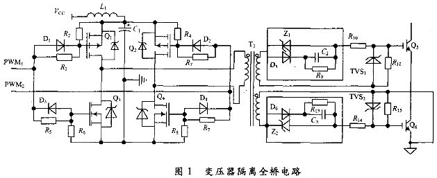 在中頻脈沖滲碳電源中,能快速進(jìn)行過流保護(hù)是至關(guān)重要的,而驅(qū)動(dòng)脈沖無延遲地傳輸,對(duì)實(shí)時(shí)過流保護(hù)起至關(guān)重要作用;同時(shí)為了減少開關(guān)損耗,還要求很陡的驅(qū)動(dòng)脈沖上升沿和下降沿;一些特殊場(chǎng)合要求緊湊而簡潔、不附加驅(qū)動(dòng)電源等。綜合考慮以上要求,采用變壓器隔離全橋驅(qū)動(dòng)電路,其電路如圖1所示。