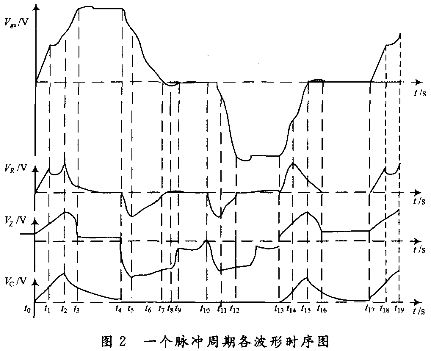 此電路具體工作過程分析如下:圖2是一個(gè)脈沖周期,當(dāng)正脈沖上升沿(t0~t3)到來時(shí)(這里只考慮正脈沖),電容C相當(dāng)于短路,通過二極管D和電容C可以給IGBT提供很大的瞬間電流,把驅(qū)動(dòng)脈沖的上升時(shí)間縮短。圖2中正脈沖就是IGBT的驅(qū)動(dòng)信號(hào),這個(gè)負(fù)脈沖的上升沿又是由另外一路驅(qū)動(dòng)脈沖感應(yīng)過來的,所以所要討論的就是另一路驅(qū)動(dòng)脈沖的下降沿尖峰,這四路輸出脈沖是一樣的,所以只要討論一路。但是為了直觀、完整,這里就把它看作是本路負(fù)脈沖的上升沿來討論(下面提到的負(fù)脈沖都是這種情況)。當(dāng)然穩(wěn)壓管這條支路也有電流流過,但是與加速電容C這條支路相比就很小。若不加電阻R,這個(gè)電容會(huì)經(jīng)過幾個(gè)脈沖周期充滿電荷,而失去加速作用,所以要求電容C的電荷在每個(gè)周期上升沿到來時(shí),電容上無存儲(chǔ)電荷。因此在電容上并聯(lián)一小阻值的電阻,給電容提供放電回路。在脈沖平頂期(t3~t4)時(shí),IGBT的輸入門極電容已經(jīng)充滿,門極保持高電平,此時(shí)IGBT的G-E之間相當(dāng)于斷開,變壓器次邊保持高電平。當(dāng)脈沖下降沿(t4~t9)到來時(shí),IGBT的輸入電容在這段時(shí)間反向放電,需緩關(guān),如果放電速度太快會(huì)引起極大的關(guān)斷尖峰,因此需阻斷通過加速電容加速放電,故在加速電容前面串聯(lián)一個(gè)快恢復(fù)二極管,使其只通過穩(wěn)壓管放電。穩(wěn)壓管可以很好地吸收其尖峰,并可以控制其下降沿的陡度。