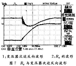 R1實(shí)際值很小,可以忽略。穩(wěn)壓二極管并聯(lián)在D1,C1兩端,它的電壓是D1和C1兩端電壓之和。穩(wěn)壓二極管是隨電流大小自動(dòng)調(diào)整的“可變”電阻。通過改變電阻來控制上升沿和下降沿的速率,從而達(dá)到控制過沖尖峰的大小。實(shí)測(cè)Rg與驅(qū)動(dòng)變壓器次邊反向波形如圖7所示。Rg上電壓波形即為勵(lì)磁電感上流過的電流波形。正脈沖下降沿的過沖尖峰由勵(lì)磁電感造成的: