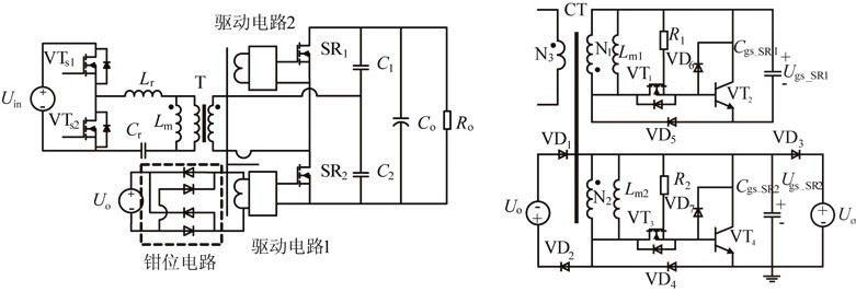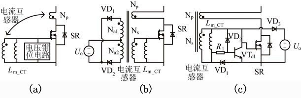 圖7為幾種典型的電流型驅動方案。傳統的電流型驅動方案如圖7(a)所示,整個驅動電路包括一個電流互感器(CT)和一個電壓箝位電路。電路通過電流互感器對電流信號進行采樣,并給同步管提供相應的驅動信號,多余的驅動能量被箝位電路消耗。該驅動電路比較簡單,但是有較大的驅動損耗,限制了變流器效率的提高。因此有文獻提出了具有剩余驅動能量回饋功能的電流型驅動方案,如圖7(b)所示。該驅動電路中多余的驅動能量能通過輔助繞組回饋到主電路,從而可以較大的減少驅動電路的損耗,并簡化電流互感器的設計,但是多繞組的電流互感器大大增加了生產成本。另有文獻提出了一種更為簡單的電流型驅動方案,如圖7(c)所示。該方案的電流互感器只需一個副邊繞組,同時也具有剩余驅動能量回饋的功能,更加有利于實際的生產應用。通過三極管VTd1,它可以準確地檢測同步整流管應該關斷的時刻,從而保證了同步整流電路的可靠性。