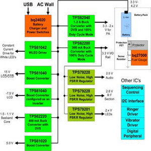 在這個解決方案中,就算鋰離子電池下降至3.3V 左右,在100%負載周期模式下工作的高效率TPS62200降壓轉換器仍能提供3.3V 的I/O電壓。上述所有零件都采用SOT-23 封裝,除了bq24020 電池充電組件、TPS61020 升壓轉換器以及TPS61042 白光二極管驅動組件之外,它們是采用3×3 平方厘米的QFN 封裝。TPS61040 和TPS61042 還內建上端FET 晶體管,每顆組件只需要一個外接二極管。bq24020、TPS622xx、TPS61020 和線性穩壓器組件全都內建FET 晶體管,功率放大器和中央處理器電源采用的動態電壓調整技術可以提高每顆零件的效率,進而協助降低功耗。
