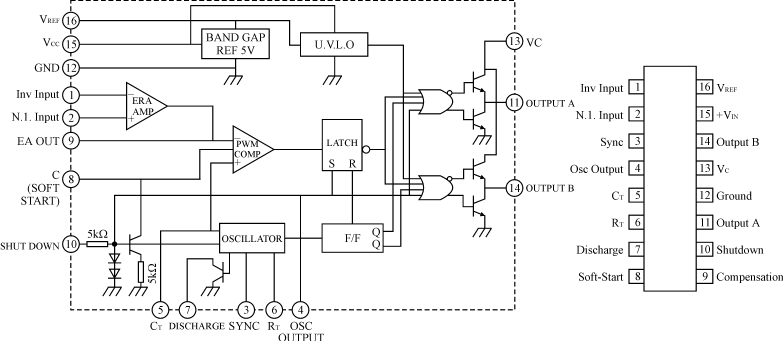 SG3525為16腳芯片,具體的內部結構和封裝如圖3所示。其中,腳16為SG3525的基準電壓源輸出,精度可以達到(5.1±1%)V,采用了溫度補償,而且設有過流保護電路。腳5,腳6,腳7內有一個雙門限比較器,內電容充放電電路,加上外接的電阻電容電路共同構成SG3525的振蕩器。振蕩器還設有外同步輸入端(腳3)。腳1及腳2分別為芯片內誤差放大器的反相輸入端、同相輸入端。該放大器是一個兩級差分放大器,直流開環增益為70dB左右。根據系統的動態、靜態特性要求,在誤差放大器的輸出腳9和腳1之間一般要添加適當的反饋補償網絡。