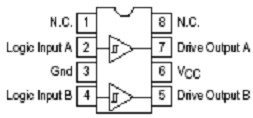 MC34152的外圍電路簡單,應用方便。它是8管腳的同相推挽驅(qū)動芯片,具體的內(nèi)部結構和封裝如圖4所示。2,4腳為兩路控制信號輸入,經(jīng)過芯片內(nèi)部的推挽放大,直接輸出同相的兩路驅(qū)動信號(7,5腳)。為使芯片更加穩(wěn)定地工作,一般在芯片的電源端并聯(lián)一個濾去高頻干擾的瓷片電容和一個濾去低頻干擾的電解電容。