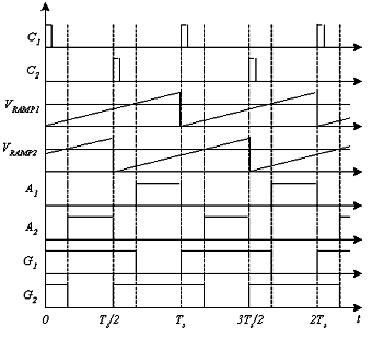 如圖3所示,時鐘信號C1和C2相差180度,它們分別對應的鋸 VRAMP1 和 VRAMP2 也相差180度,電壓誤差放大器的輸出信號 VEA、Vo 分別與 VRAMP1 和 VRAMP2 相比較,再通過兩個RS觸發(fā)器得到相差180度的驅(qū)動信號 G1 和 G2 。