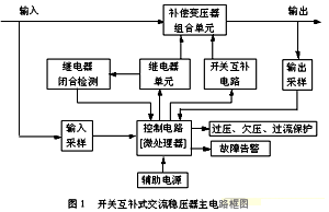 本穩壓器由補償變壓器組合單元、繼電器單元、開關互補電路、控制電路、過欠壓以及過流保護及故障告警電路、輔助電源等部分組成,整機框圖如下: