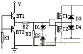 關互補電路實際上是繼電器的一個旁通電子開關,采用兩只IGBT、兩只二極管構成的交流通路,是互補式交流穩壓器的主要技術點,電路如圖3: