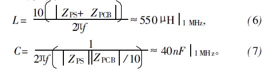 第1步應選定濾波器拓撲結構。常用阻抗匹配的拓撲結構有4種,分別是并聯電容、串聯電感、L-C回路和C-L回路。ZPS和ZPCB的阻抗都在幾十歐至幾百歐間,若采用并聯電容拓撲結構,并聯電容的值要遠小于ZPS ||ZPCB的并聯電容,若采用串聯電感拓撲結構,串聯電感的值要遠大于ZPS+ZPCB的串聯電感,按并聯電容和串聯電感拓撲結構分別估算出C和L的值為: