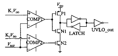 圖2給出第一種欠壓鎖定電路的原理圖,稱為U-VLO1,這是用兩個比較器實現的欠壓鎖定電路。VDD是外部供電電壓源,K1、K2 是小于1的常數,且K1>K2,VREF為1.25 V帶隙基準電壓,LATCH是由兩個反相器組成的鎖存器。圖中標的UVLO_out代表欠壓鎖定信號,狀態設置是UVLO_out=0時有效。