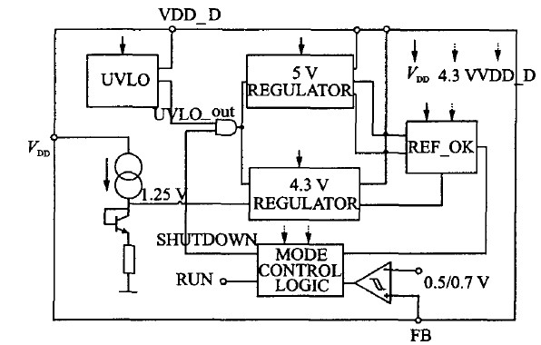 4.3 V 的穩定電壓源(VDD-AD)用來在輕載時為系統供電,始終保持工作,在BURST模式下由它為模擬模塊供電。