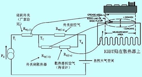 圖2中:rθ(j-c)是器件結到管殼基準點穩態熱阻,由制造廠家提供,一般在數據表中給出上限值或給出瞬態熱阻曲線取t→∞的穩態值;rθ(c-a)是管殼未通過散熱器直接到空氣的熱阻,通常不考慮;rθ(c-s)是管殼到散熱器的觸熱阻,通常由制造廠家在數據表中給出;rθ(c-a)是散熱器基準點到環境基準點的熱阻,其值由散熱器形式、尺寸和冷卻方式決定;ta是環境溫度。