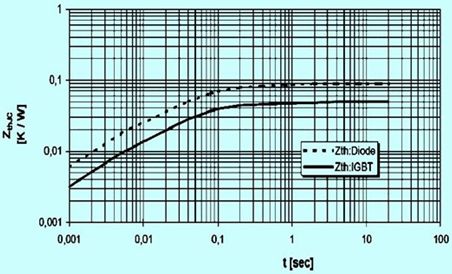 通常處于周期性脈沖功耗負載下的平均和最大結溫可以參考廠家所給出的瞬態熱阻曲線來計算。如圖3示出了eupc型號為bsm400ga120dlc的igbt模塊瞬態熱阻曲線zthjc=f(t)。