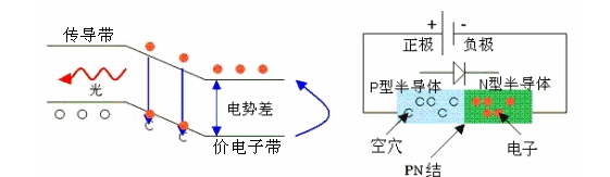 LED是電子二極管的一種,主要構造是PN結。如圖1,當向LED的兩端施加電壓,電子就會吸收能量并向價電子帶轉移,然后再將吸收的能量釋放出來。這個被釋放出的能量就是光。放出的光的波長和顏色是由半導體的電勢差決定的。