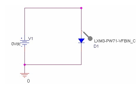 我們用電路仿真來說明LED的電子特性以及驅動電路。電路仿真是對LED和電阻等的電子設計進行建模并在計算機上模擬計算電路運行的一種簡易方法。這里使用的是Cadence公司的電路仿真PSpice A/D。同時使用了飛利浦照明公司的LUXEON系列LX3-PW71。