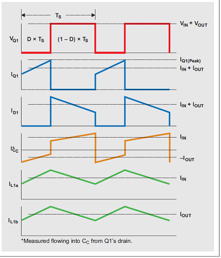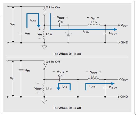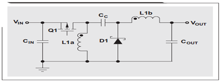 Q1 關閉時,L1b 的電壓必須為 VOUT,因為其與 COUT 并聯。由于 COUT 被充電至 VOUT,因此 Q1 關閉時 Q1 的電壓為 VIN + VOUT;這樣一來, L1a 的電壓便為相對于 Q1 漏極的 –VOUT。Q1 開啟時,充電至 VOUT 的電容 CC 與 L1b 串聯;因此 L1b 的電壓為 +VIN,而二極管 D1 的電壓則為 VIN + VOUT。